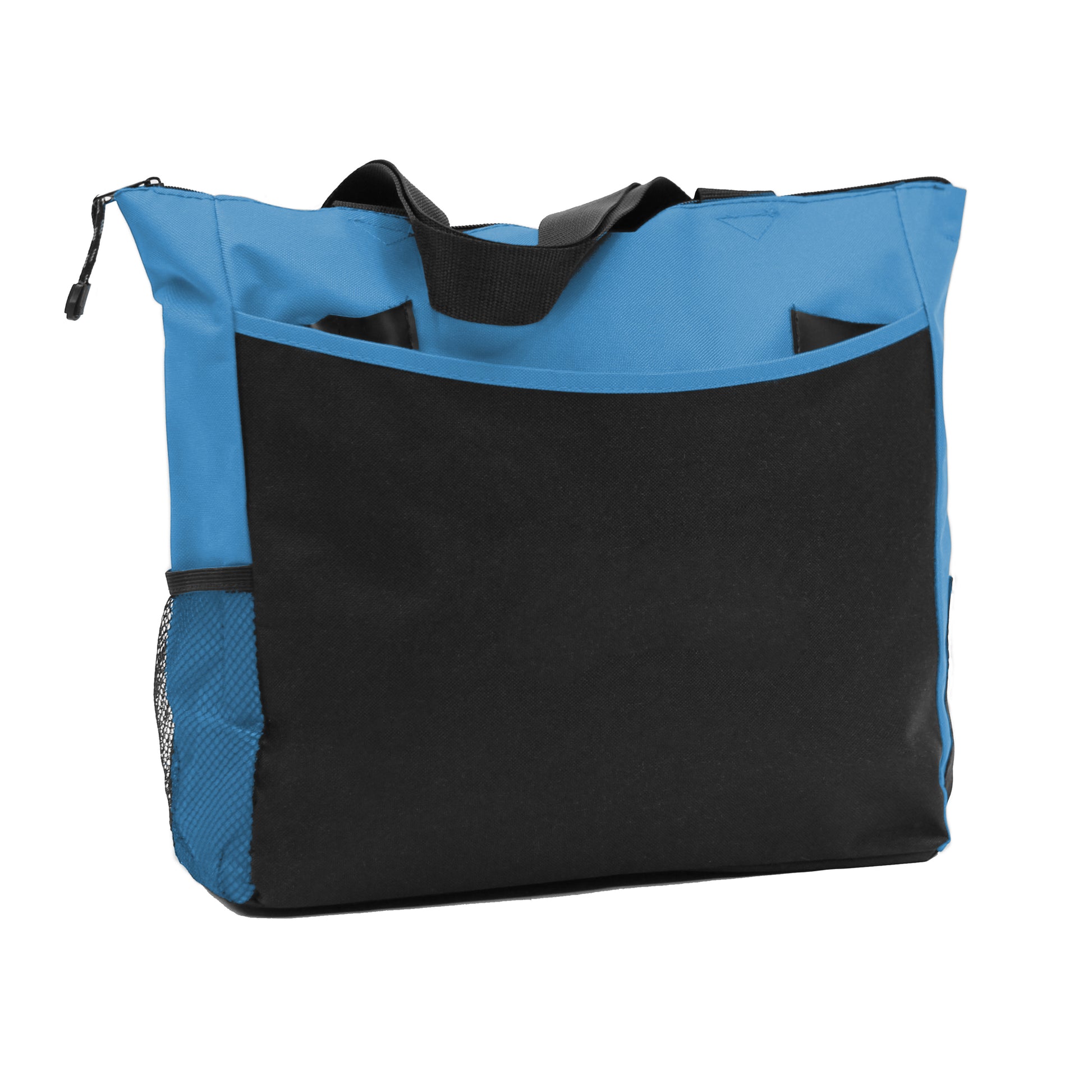 Over the shoulder straps Main pocket: Zip-top closure for secure travel 1 Front pocket: conceals 2 pen pockets & 1 small pocket 2 Side pockets Thick & durable fabric